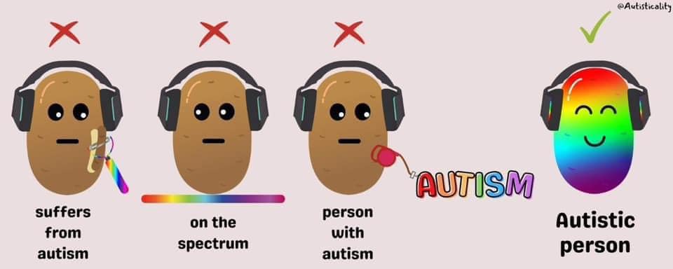 We think that the Autistic community is split because of “Autism moms” – those parents of Autistic children who co-opt their child’s identity with a victim mentality and there is. Absolutely there is. Their use of person-first language ( with autism) automatically shows the rift with Autistic people who use the social model (Autistic).